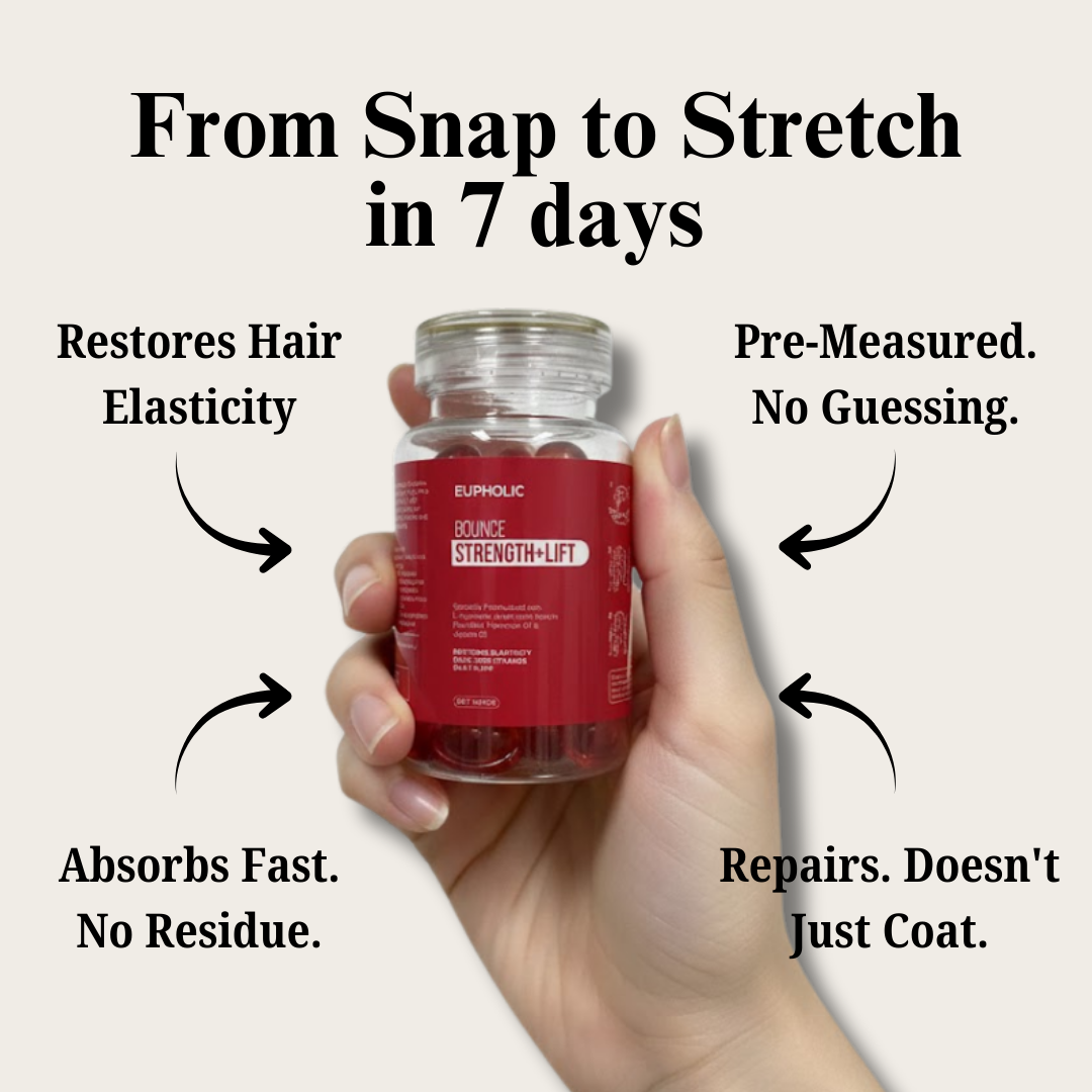 The elasticity capsule that stops the snap. Most products coat the surface. Bounce rebuilds the source — delivering L-Cysteine and keratin peptides that absorb into the hair fiber to restore the elastic bonds that let hair bend instead of snap.